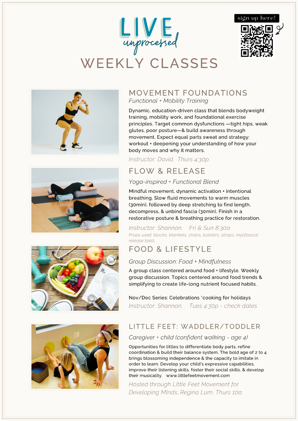 A variety of classes and programs available for Food, Movement, and Mindfulness both in studio and online.